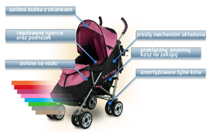 • składanie wózka do postaci parasolki (świetny na podróż, zmieści się nawet do niedużego bagażnika)