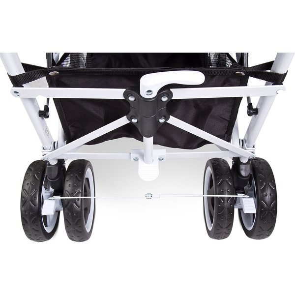 Wózek został wyposażony w przedłużaną budkę wraz z dwoma okienkami, dzięki czemu skutecznie ochroni przed promieniami słonecznymi jak i da możliwość obserwacji malucha przez mamusię podczas spaceru. Lekka aluminiowa konstrukcja, obszerna wkładka na siedzisko wraz z oparciem, łatwość składania oraz niewielkie wymiary po złożeniu to niewątpliwe atuty tego bogato wyposażonego wózka.