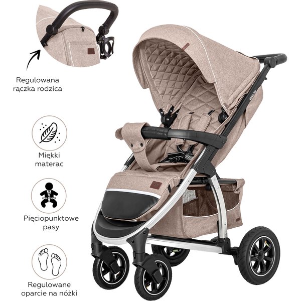 - duży komfort podróżowania dla maluszka dzięki nadmuchiwanym kołom z amortyzacją,