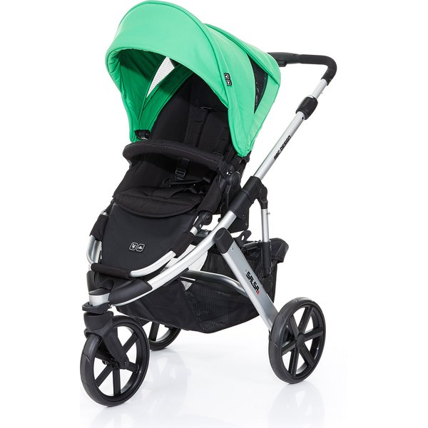 - wózek spacerowy Salsa 3 na srebrnej ramie, budkę w zielonym kolorze oraz pałąk zabezpieczający