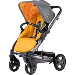 • wózek spacerowy X-Cite w kolorze SUNNY ORANGE (szary z pomarańczową wyściółką), wbudowaną moskitierą, okryciem na nóżki oraz pałąkiem