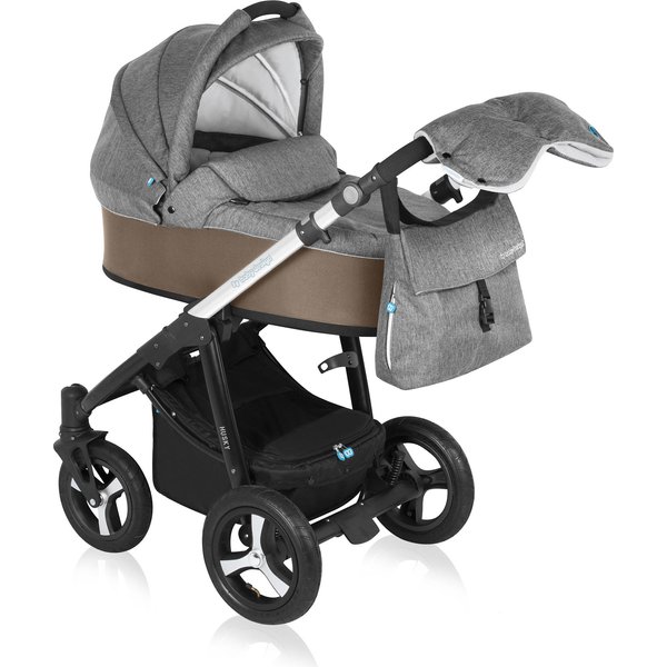 • wózek wielofunkcyjny Lupo Husky w kolorze beżowo-szarym z gondolą oraz siedziskiem spacerowym oraz praktycznymi akcesoriami (torba zawieszana na rączce wózka z przewijakiem, ciepłe okrycie i folia przeciwdeszczowa na gondolę, pokrowiec na nóżki oraz folia do spacerówki, kosz na zakupy)