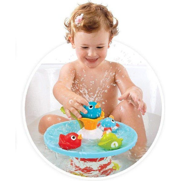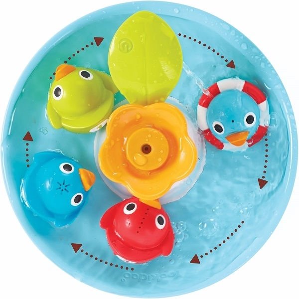 Jednak fontanna nie tylko dostarczy świetnej zabawy. Maluch może wyciągać kaczuszki i wsadzać je z powrotem co wspomoże ćwiczenia motoryki oraz koordynacji oko-ręka u dziecka. Zabawkę można również wykorzystać do nauki kolorów lub cyfr. Gdy jednak kaczuszki już się zmęczą wyścigami dookoła, można każdą z nich ustawić na górze fontanny co sprawi, że zaobserwujemy różne efekty wodne.