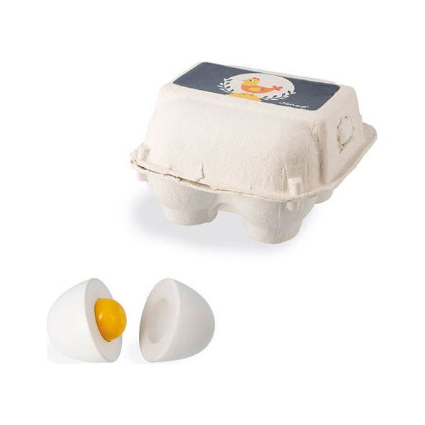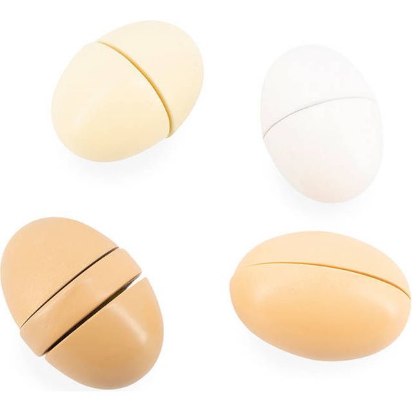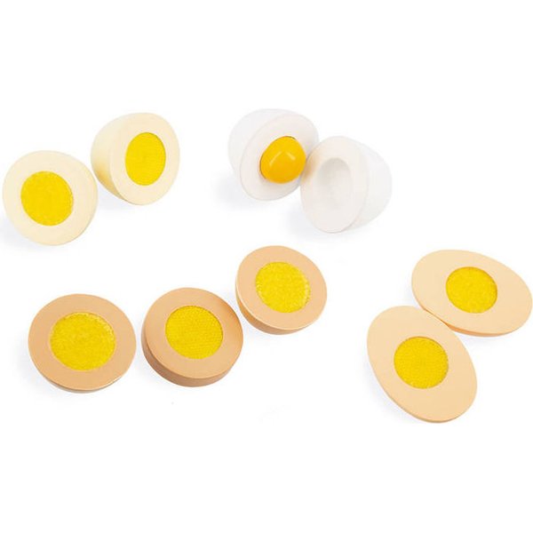 Wchodzące w skład zestawu jajka w kolorze białym, kremowym i beżowym nie są monolitem, lecz można je podzielić na części, które łączą się na rzep lub magnes. Ich wielkość odzwierciedla rzeczywiste wymiary jedzenia, podobnie jak kolorystyka. Idealnie sprawdzą się jako uzupełnienie dziecięcej kuchni lub osobny prezent, pozwalający maluchowi ćwiczyć zdolności manualne, kreatywność i wyobraźnię podczas naśladowania dorosłych.