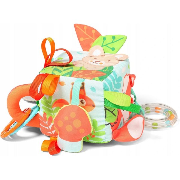 Sensoryczna kostka od Babyono pełna niespodzianek! Posiada wiele żywych barw co pozwoli pobudzić zmysł wzroku. Wesołe zwierzątka zachęcą maluszka do zabawy oferując mu wiele ciekawych zajęć. Liczne, wystające elementy takie jak kolorowe tasiemki czy kółka, zachęcą do chwytania ich. Wspomaga to rozwój małej motoryki i zmysły dotyku. Zabawka również nie przejdzie obojętnie obok słuchu. Wyposażona została w piszczek i grzechotkę, które z pewnością przykują uwagę. Przydatny będzie także specjalny gryzak, który przyniesie ukojenie bolesnym dziąsełkom w okresie ząbkowania. Można ją wyprać w temperaturze 30 stopni.