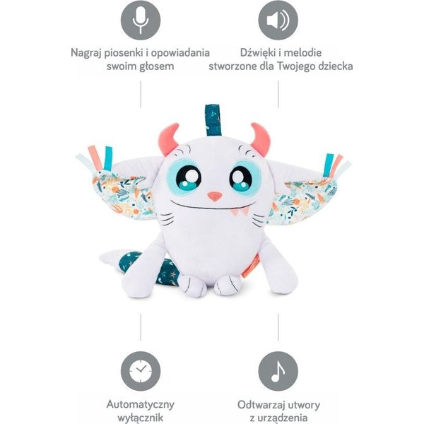 Pozwól poznać swojemu dziecku moc muzyki i nauczyć się rozpoznawać emocje! Z tym sympatycznym stworkiem Twoja pociecha może liczyć na ponowne usłyszenie uspokajającego bicia serca mamy, odgłosu morskich fal lub śpiewających ptaszków. Zapoznaj swoje dziecko z muzyką klasyczną lub nagraj własne utwory. Pamiętaj, że dla Twojej pociechy jesteś najlepszym wokalistą/wokalistką na świecie!