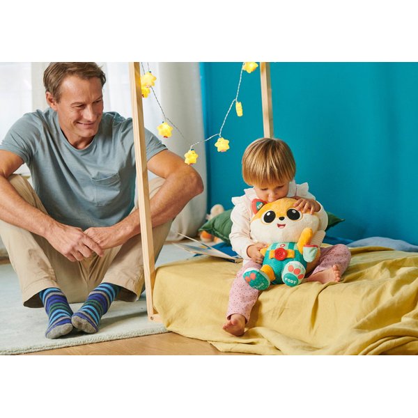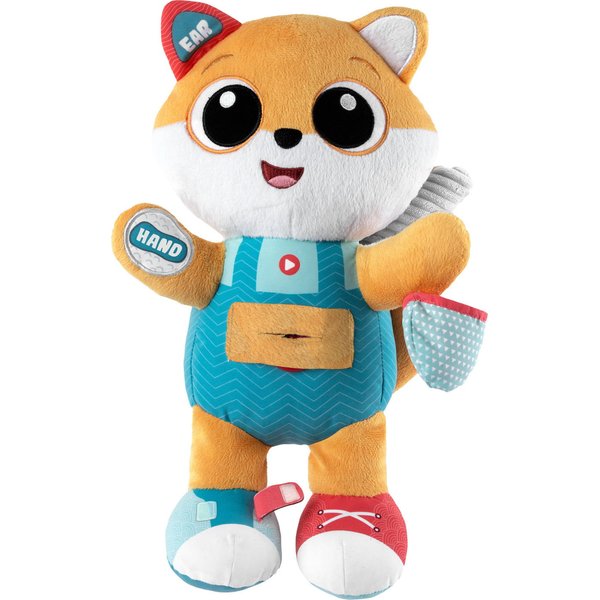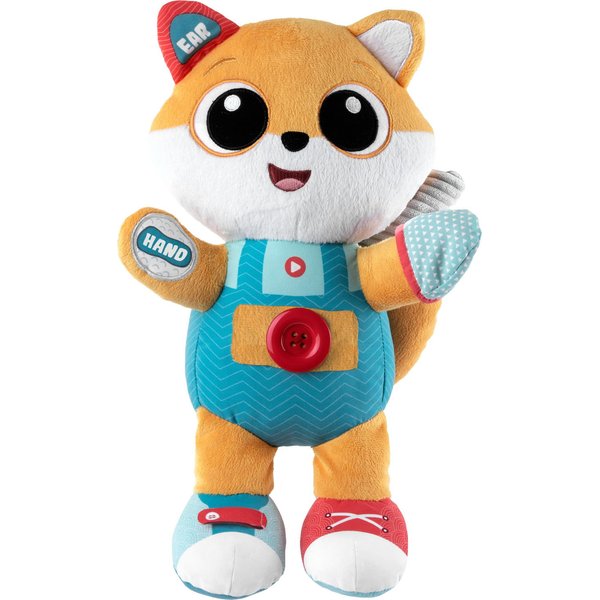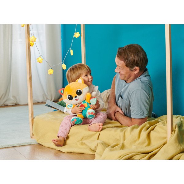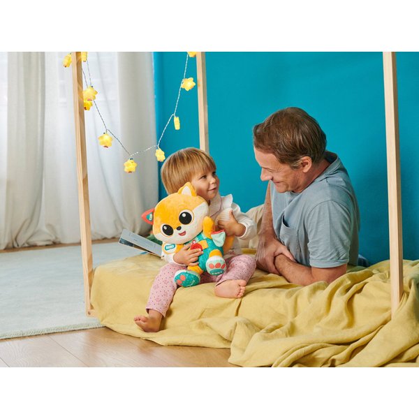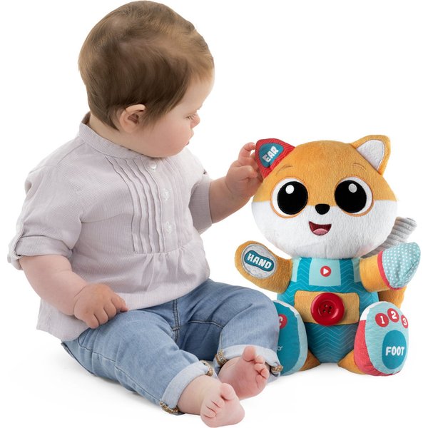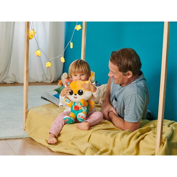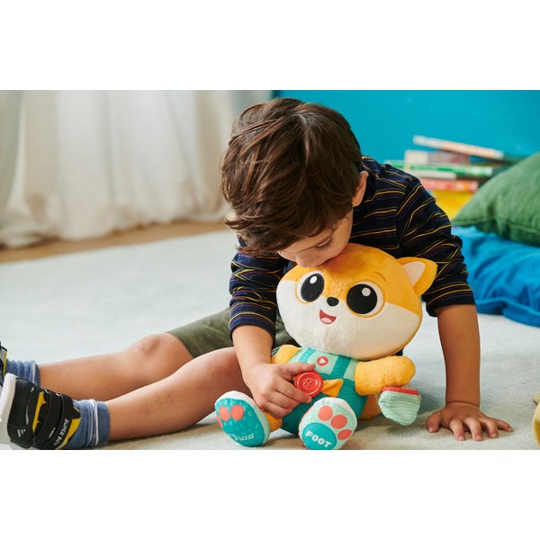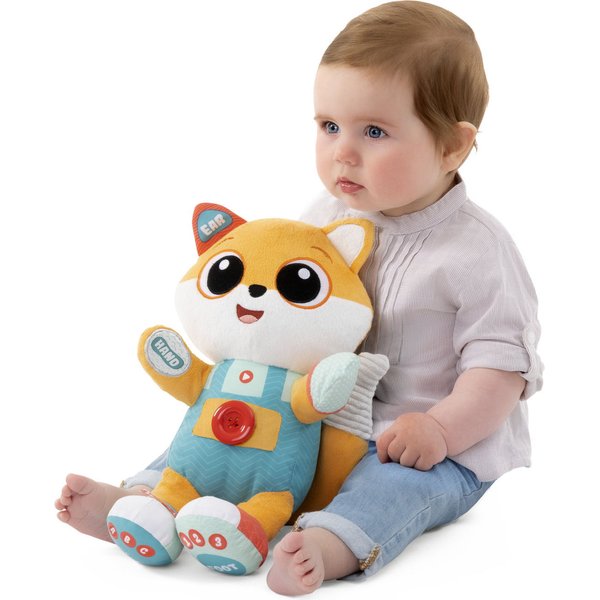 Interaktywny pluszak jest przeznaczony dla dzieci już od 6. miesiąca. Sympatyczny lisek nauczy Twoją pociechę wielu słów w dwóch językach: po polsku i angielsku. Maluch ma za zadanie nacisnąć jeden z 4 przycisków, aby posłuchać poszczególnych słów, zwrotów , rymowanek i piosenek w języku polskim i angielskim. Dziecko pozna bliską sobie tematykę: części ciała, ubrania, liczby, ubieranie się.