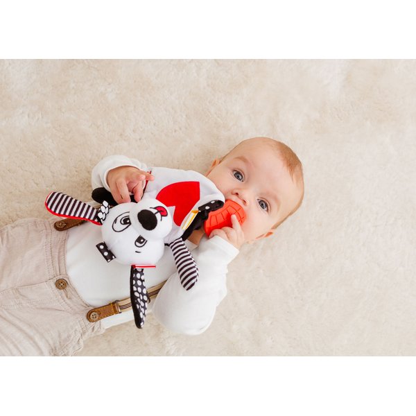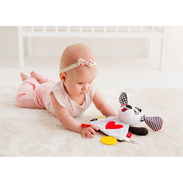 Szeleszczący Piesek Pedro Sensory od Balibazoo idealnie sprawdzi się jako pierwsza zabawka dla nowo narodzonego maluszka.