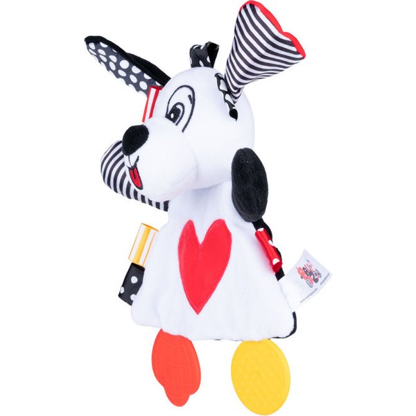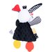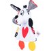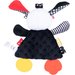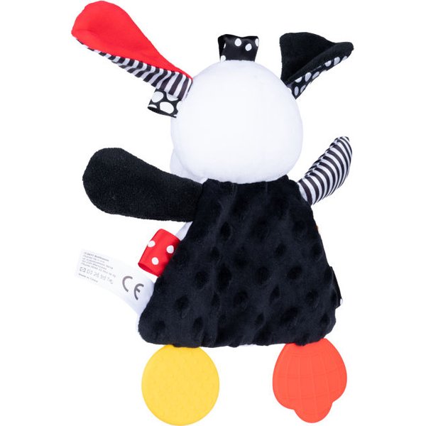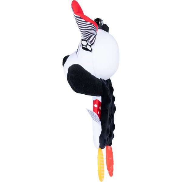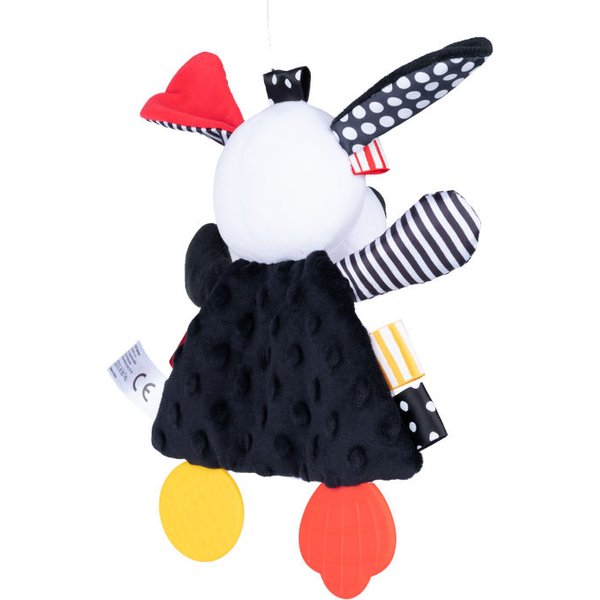 Model ten posiada przyciągającą wzrok malca kontrastową kolorystykę oraz bardzo przyjemną w dotyku tkaninę o zróżnicowanych fakturach. W korpusie zabawki ukryto szeleszczący element, który budzi ciekawość dziecka i pozytywnie wpływa na rozwój słuchu. Dużą zaletą są miękkie stopy pełniące funkcję gryzaka. Przyniosą one ulgę podczas bolesnego procesu ząbkowania.