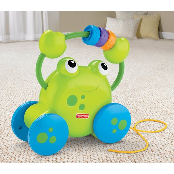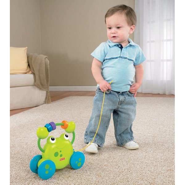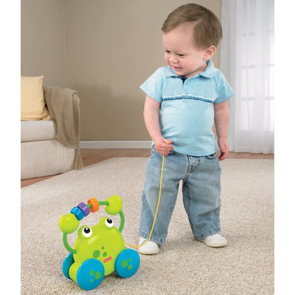Podczas jazdy i ciągnięcia nad głową żabki grzechoczą kółeczka. Zachęca to dzieci do zabawy, uczy związku przyczynowo- skutkowego oraz aktywizuje dzieci do samodzielnego chodzenia.