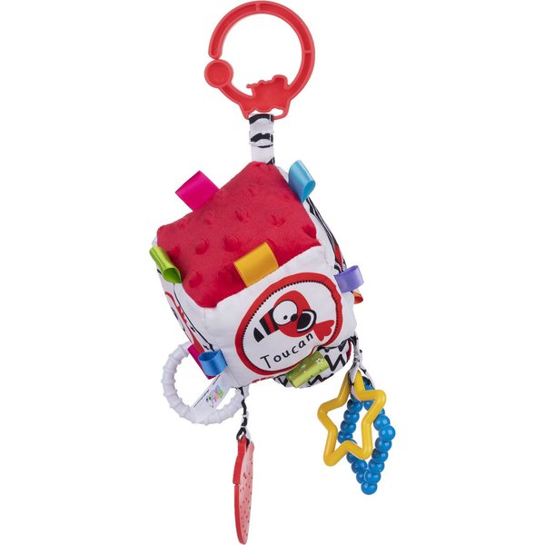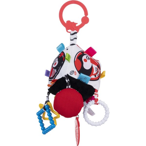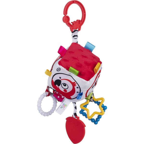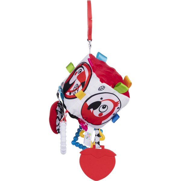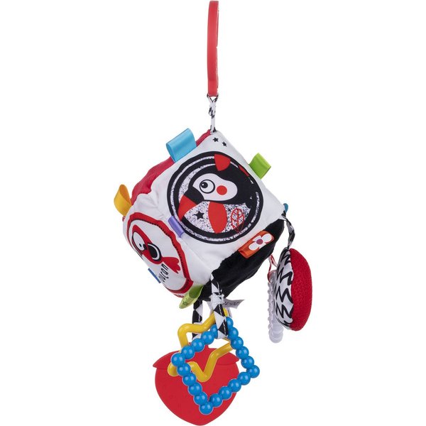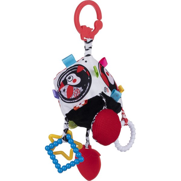 Sensoryczna kostka od Balibazoo, która zadba o rozwój dziecka. Wyposażona w kontrastowe barwy, pozwoli pobudzić zmysł wzroku do działania. Wykonana z materiałów o różnych fakturach, które zachęcą maluszka do trenowania dotyku. Kostka posiada również ukrytą grzechotkę oraz doczepianą piszczałkę, które odpowiednio zadbają o słuch. Specjalny pierścień umożliwi zawieszenie zabawki w łóżeczku czy wózku, dzięki czemu może ona towarzyszyć dziecku gdzie tylko trzeba. Kostka wyposażona została również w gryzaczki oraz kolorowe metki.