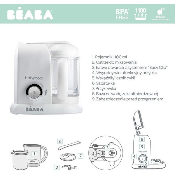 Babycook sprawdzi się również gdy wyjedziemy na wymarzony urlop, jego niewielkie rozmiary sprawią że w prosty sposób zabierzesz go ze sobą. Cała obsługa urządzenia można wykonywać jedną ręką to rozwiązanie jest dla mam bardzo pomocne! Przycisk "easy clip" - to łatwe i bezproblemowe wyjęcie dzbanka, otworzenie go i nałożenie posiłku.