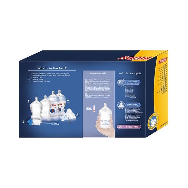Zestaw marki Nuby zawiera wszystkie potrzebne produkty do karmienia - idealny zestaw startowy. Miękka silikonowa butelka jest naturalna jak pierś matki oraz utrzymuje temperaturę mleka. Butelki wyposażone są w zaworki antykolkowe, które zapobiegają powstawanie bolesnych dla maluszka kolek.