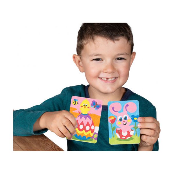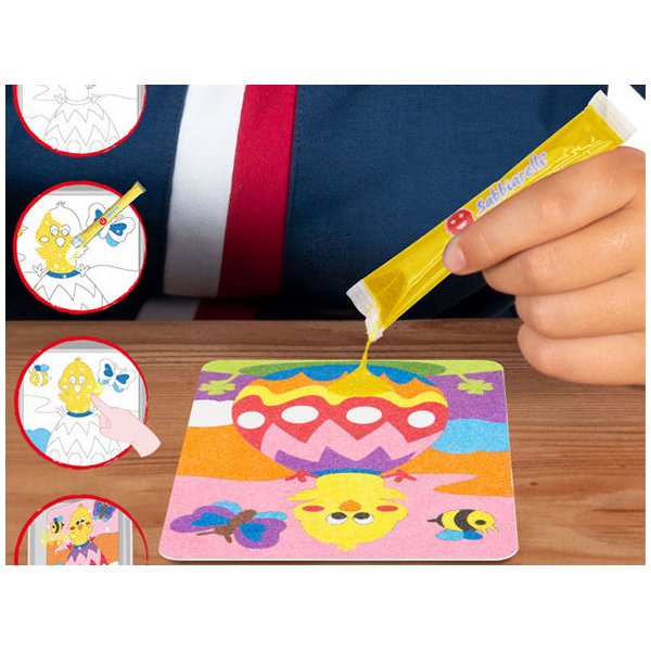 Produkt ten został opracowany na potrzeby młodszych dzieci. Już 3-latek bez problemu poradzi sobie z kolorowaniem za pomocą piasku. W opakowaniu znajduje się 12 saszetek z kolorowym piaskiem wyprodukowanym ze zmielonego marmuru. Ten nietoksyczny proszek jest łatwy do aplikacji na obrazkach i nie wymaga użycia kleju. Kontakt z piaskiem zapewni Twojemu dziecku sensoryczne doznania i pozwoli na łatwe wykonane naprawdę oryginalnej pracy. A wszystko to bez użycia kleju, nożyczek lub brudzących farb! Maluch ćwiczy zdolności manualne, plastyczne, wyobraźnię oraz kreatywność.