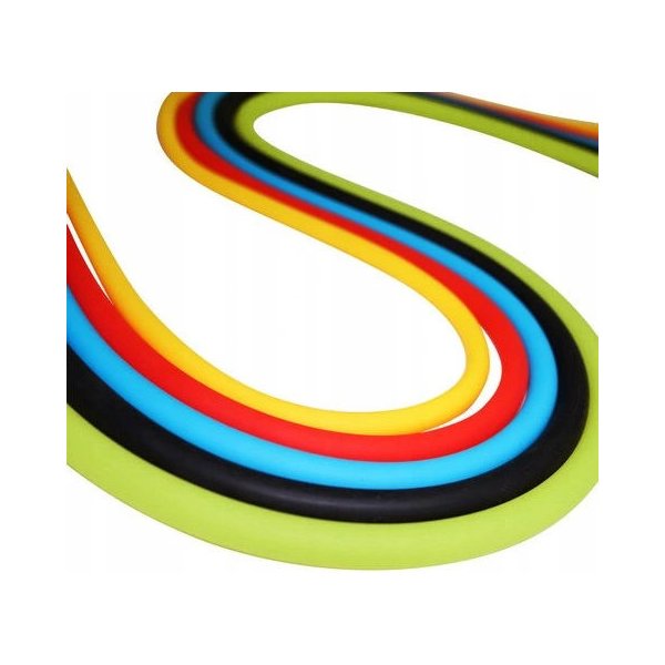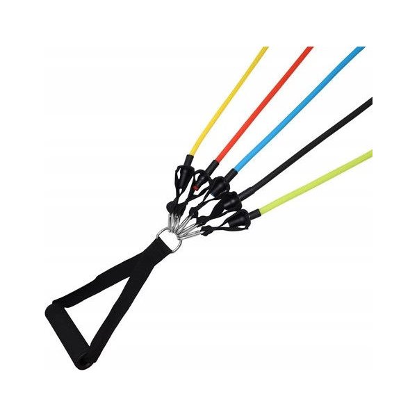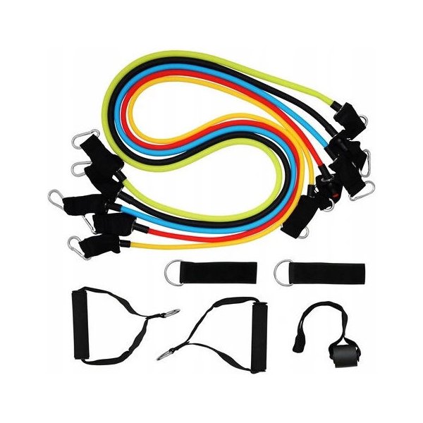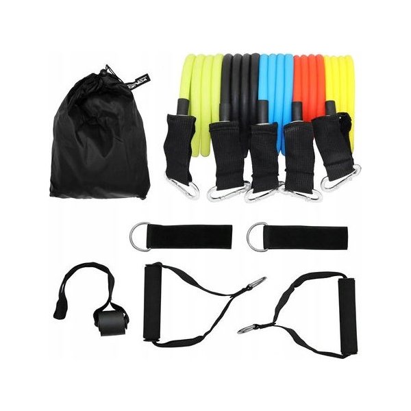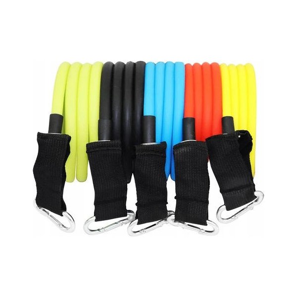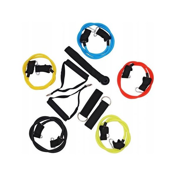 5 linek o długości 120cm mają różne średnice, co przekłada się na różnice w poziomach oporu. Zestaw ekspanderów jest lekki i nie zajmuje wiele miejsca, co umożliwia zabranie go ze sobą w każde miejsce. Odporny na pękanie materiał lateksowy zapewnia stały naciąg oraz bezpieczeństwo treningu. Zastosowanie metalowych karabinków podnosi trwałość ekspanderów.