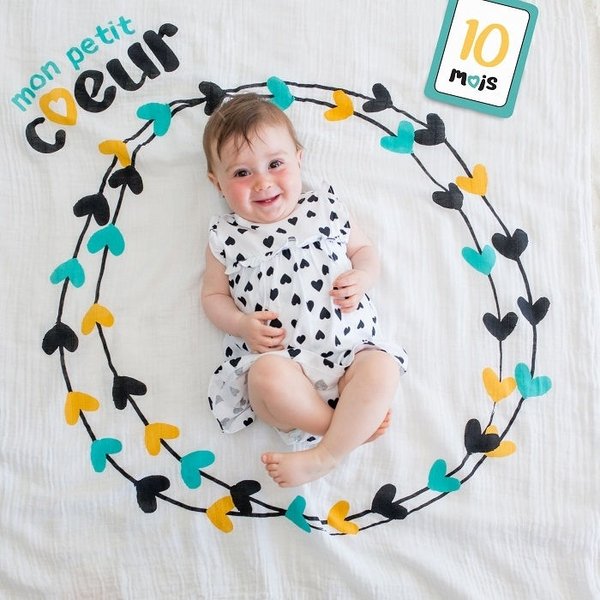 W zestawie znajduje się kocyk muślinowy o dużych rozmiarach, który sprawi się także jako prześcieradło, otulacz, czy osłona wózka w upalne dni oraz 7 dwustronnych kart na których widnieją napisy z dniami, miesiącami i rokiem by uwieczniać chwile z życia naszego malucha. To niezbędny zestaw dla malucha!