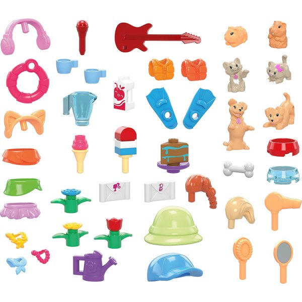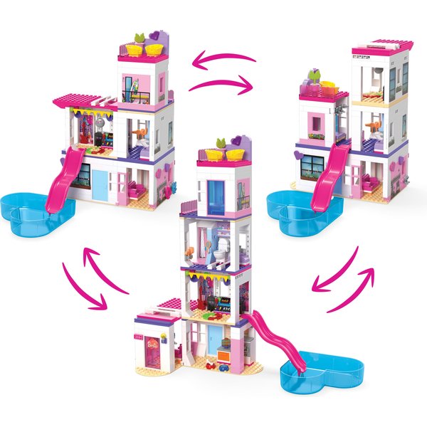 W 7 torebkach z niespodziankami znajduje się jeszcze 6 zwierzątek i akcesoria tematyczne związane z domem i postaciami. Po skończonej zabawie z kolorami warto rozpocząć budowę domku. Do skonstruowania czekają kuchnia, sypialnia, sala taneczna, salon, łazienka, winda. Atrakcji na pewno nie zabraknie, skoro do dyspozycji mieszkańców domku jest jeszcze kabriolet oraz winda i zjeżdżalnie. Dziecko może dowolnie łączyć 8 różnych modułów, aby zmieniać układ trzypoziomowego domku, dzięki czemu zabawa jest jeszcze ciekawsza. Zestaw można rozbudować za pomocą klocków z innych kolekcji Mega Barbie (do kupienia osobno).