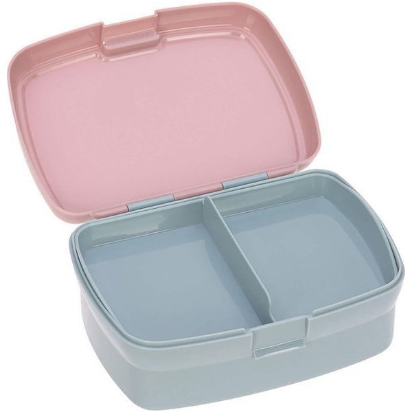 - Pojemnik który posiada jedną dużą komorę do której możemy zapakować kanapki oraz pojemnik dwudzielny np. na owoce, wafelki, który w razie potrzeby możemy bez problemu wyjąć z pudełka. Zamykany za pomocą szerokiego klipsa zapobiegnie wysypaniu się zawartości.