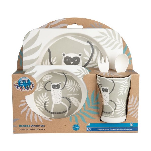 Zestaw naczyń, w którym znajdziemy talerzyk, miseczkę, sztućce i kubek są praktyczne i ułatwią podanie posiłku naszemu szkrabowi. Wykonany został w pełni z naturalnego, biodegradowalnego i ekologicznego bambusa. Zaokrąglone kształty sztućców nie podrażnią delikatnych dziąseł dziecka. Kolorowe nadruki zachęcą malucha do jedzenia. Zestaw jest lekki i poręczny, dlatego Twoje dziecko może go zabrać ze sobą wszędzie. Idealny do nauki samodzielnego jedzenia.