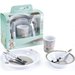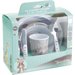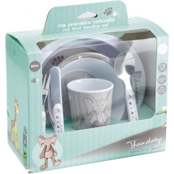 W zestawie znajdują się naczynia potrzebne do pierwszych samodzielnych posiłków twojego maluszka: głęboki talerzyk, miseczka, kubek oraz zestaw sztuców.