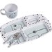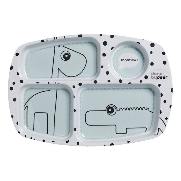 Został wykonany w 100% z melaminy i nie zawiera PVC, BPA, PMD i ftalanów. Komplet składa się z dzielonego talerzyka, kubka z uchwytem, widelca i nożyka. Talerzyk podzielony jest na komory, by rozdzielać posiłek tak jak będzie chciało Twoje dziecko.
