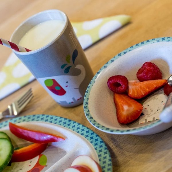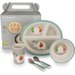 Zestaw obiadowy marki For Little Fingers to idealny zestaw do nauki samodzielnego jedzenia. Komplet składa się z talerzyka który posiada 3 przegródki, miseczki, kubeczka oraz sztućców. Naczynia te wykonane są ze 100% bambusa, dlatego też są bezpieczne dla środowiska.