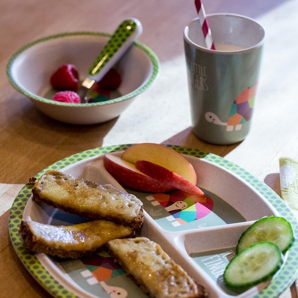 Zestaw obiadowy marki For Little Fingers to idealny zestaw do nauki samodzielnego jedzenia. Komplet składa się z talerzyka który posiada 3 przegródki, miseczki, kubeczka oraz sztućców. Naczynia te wykonane są ze 100% bambusa, dlatego też są bezpieczne dla środowiska.