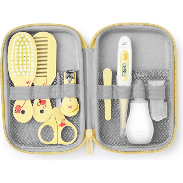 Wszystkie akcesoria do pielęgnacji niemowlaka zamknięte w eleganckim etui. Bardzo praktyczny zestaw wyposażony w niezbędne elementy. Dzięki etui wszystko można przechowywać w jednym miejscu, również bez problemu można je zabrać ze sobą w podróż czy na wizytę u dziadków. Kompaktowy zestaw zawiera wygodny w użyciu termometr cyfrowy, aspirator do nosa z miękką końcówką, miękką szczoteczkę i grzebyk do pielęgnacji włosów, cążki i nożyczki do paznokci oraz bezpieczną szczoteczkę do mycia ząbków i masażu dziąsełek.