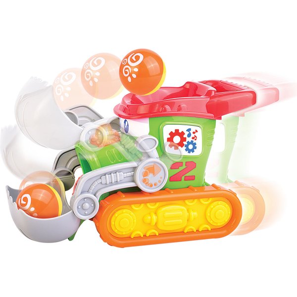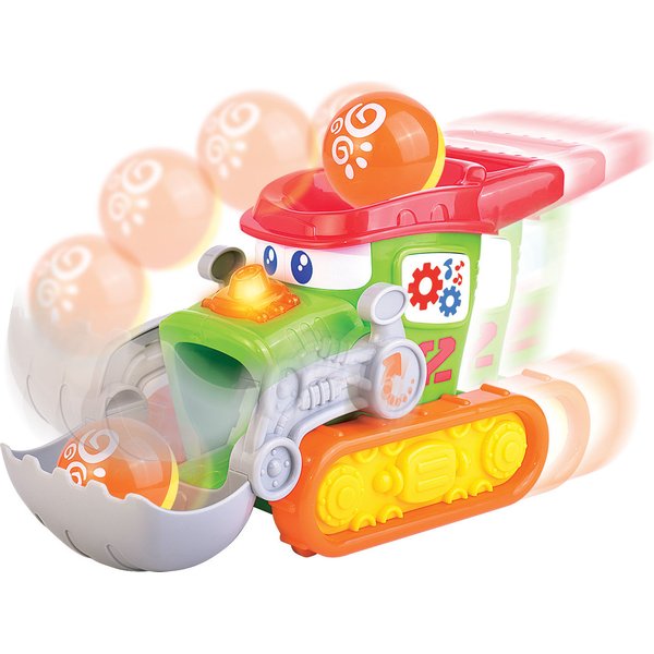 Wesoła zabawa z pojazdem, który potrafi żonglować małą piłeczką, przemieszczając ją z przodu do tyłu pojazdu. Ruchome elementy i żywe kolory przyciągną wzrok Twojego dziecka, zachęcając do dotykania i odkrywania tajemnic niezwykłego pojazdu. Niech maluszek złapie buldożer za rączkę i poprowadzi na spacer! Migające światełka i polska piosenka, którą śpiewa pojazd dodatkowo budzą ciekawość maluszka, rozwijając jego zmysły, wyobraźnię i wspierając doskonalenie koordynacji ręka - oko.